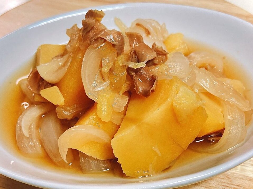 下の写真はアレンジレシピの「ほたてじゃが」。ほたてごはんの素1/2本で大きめのじゃがいも3個、玉ねぎ1個にも味がしっかりついたので、残り半分で1合の炊き込みごはんも楽しめました!1本の炊き込みごはんの素でお手軽に2品完成します♪