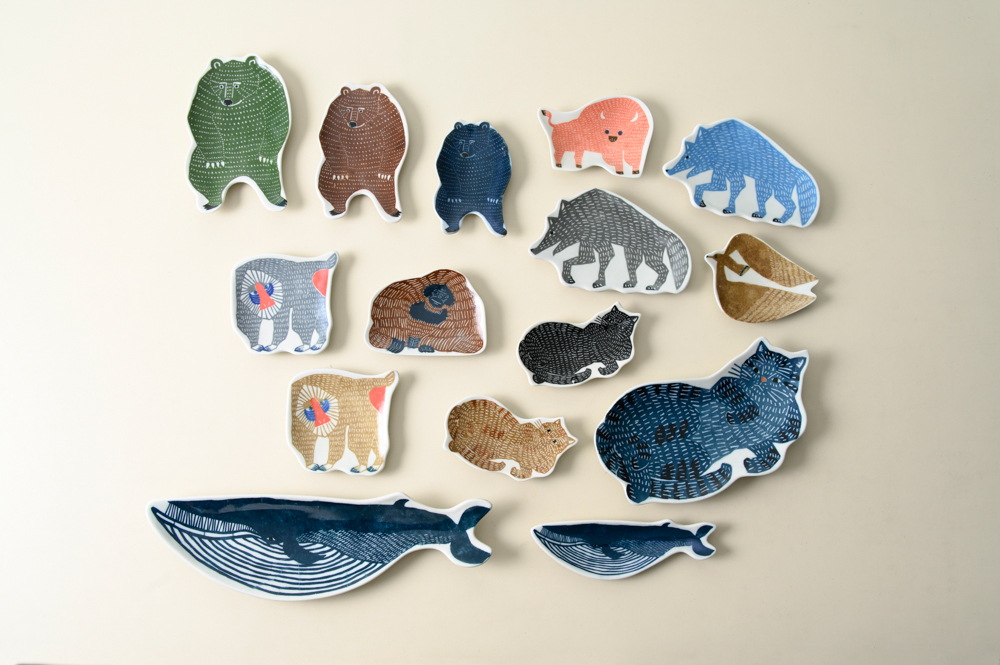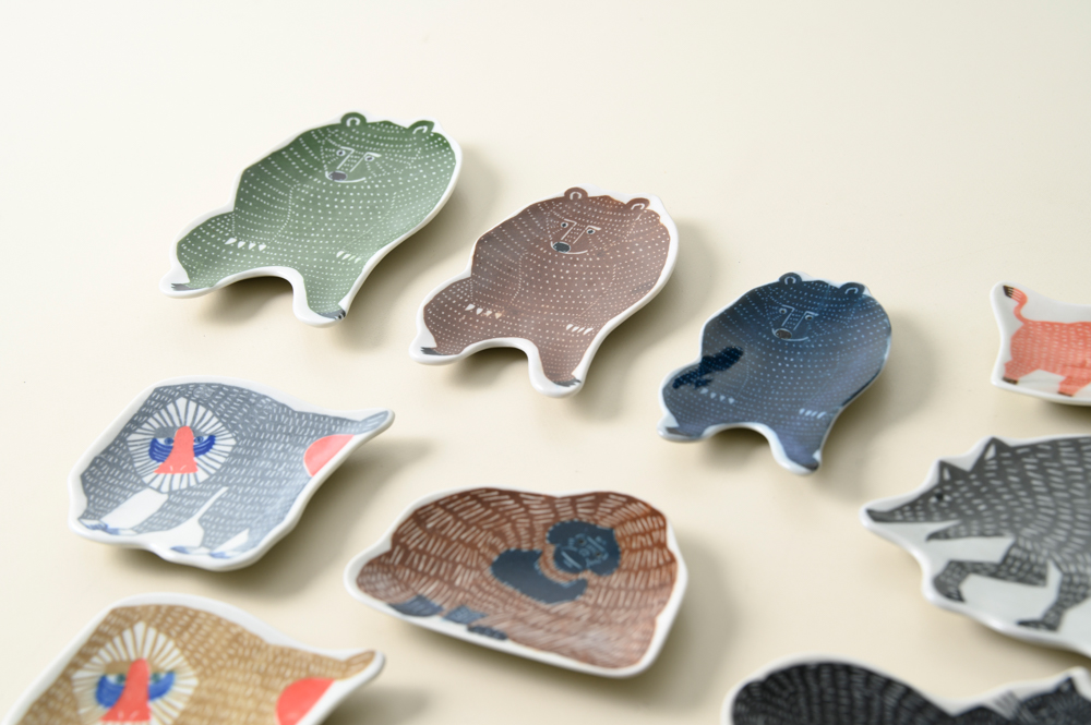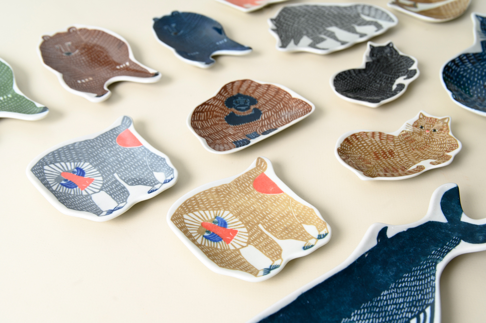 青猫 [印判手 大皿] 横21.5×縦12×高さ2cm 黒猫、トラ猫 [印判手 豆皿] 横11.6×縦7×高さ1.5cm 緑の熊 [印判手 中皿] 横9.8×縦15.8×高さ1.5cm 茶の熊 [印判手 小皿] 横8×縦13.6×高さ1.4cm 青い熊 [印判手 豆皿] 横7×縦11×高さ1.3cm 子くじら [印判手 豆皿] 横16.3×縦5.2×高さ1.3cm 親くじら [印判手 長皿] 横30×縦9×高さ2cm マンドリル(グレー、ブラウン) [印判手 豆皿] 横9.8×縦9.7×高さ1.3cm オラウータン [印判手 豆皿] 横11×縦8×高さ1.5cm アホウドリ [印判手 豆皿] 横10.8×縦8×高さ1.3cm バイソン [印判手 豆皿] 横10.8×縦8×高さ1.5cm オオカミ(グレー、ブルー) [印判手 豆皿] 横15×縦9.7×高さ1.4cm