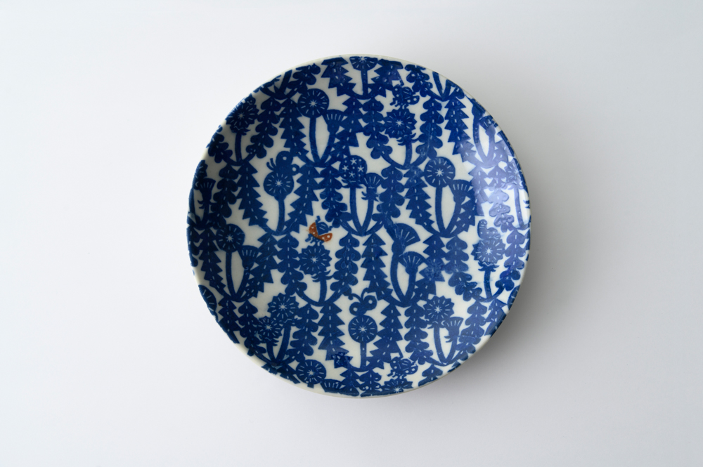 「印判手」という絵付け技法を用いています。模様を切り抜いた型紙を転写し、型で絵模様を描いたお皿です。大量プリント工場の量産品とは異なる、型による模様の手作り感を、ぜひお楽しみください。