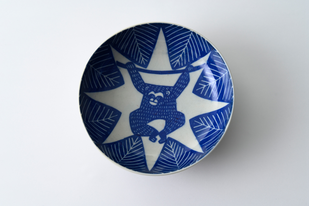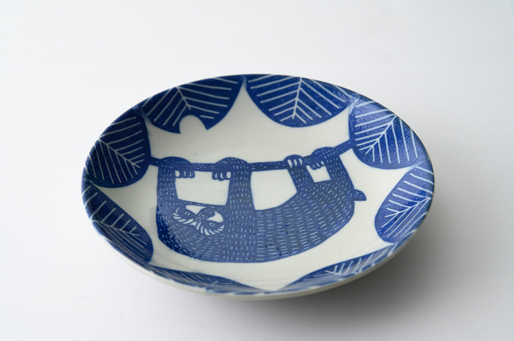 kata kataと書いて、カタカタと読みます。ご夫婦でもあるお二人は、東京造形大学卒業~オランダの芸術アカデミーに短期留学。その後、動物・海の生物・昆虫や草花など、いわば「いのち」をモチーフに、陶器や布ものを創作しているアーティストです。日本独自の歴史ある染色技法で、紙に模様を彫りぬいた「型紙」を使用する型染めや注染といった伝統の技の継承者。このお皿の動物の絵柄も、いわゆる直接の手描きではなく、手間をかけ彫りぬいた型による染めによって、絵模様化されています。