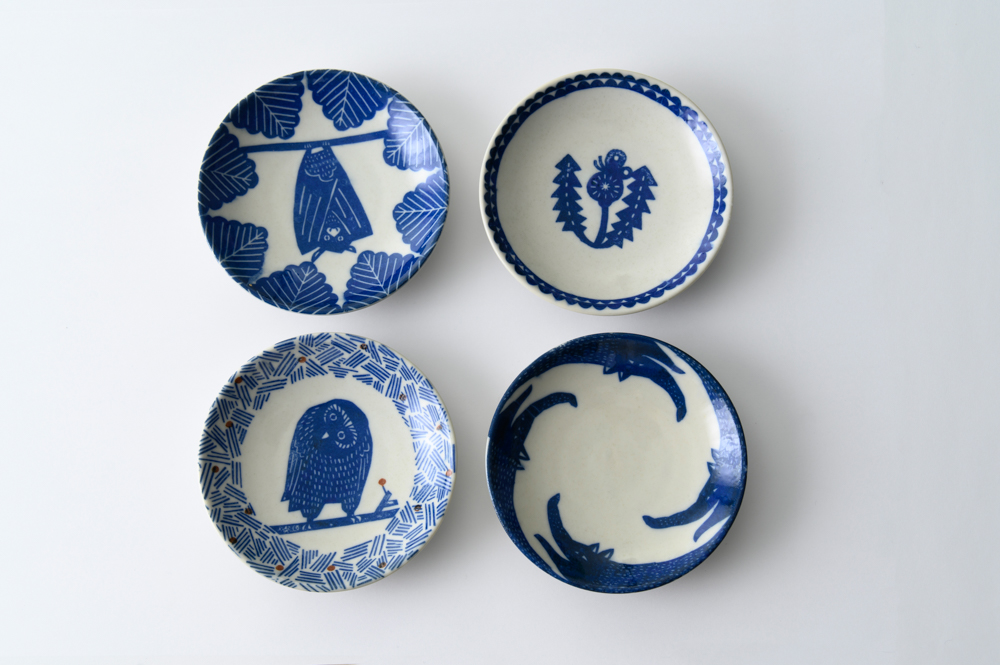ご夫婦でもあるお二人は、東京造形大学卒業~オランダの芸術アカデミーに短期留学。その後、動物・海の生物・昆虫や草花など、いわば「いのち」をモチーフに、陶器や布ものを創作しているアーティストです。日本独自の歴史ある染色技法で、紙に模様を彫りぬいた「型紙」を使用する型染めや注染といった伝統の技の継承者。このお皿の動物の絵柄も、いわゆる直接の手描きではなく、手間をかけ彫りぬいた型による染めによって、絵模様化されています。