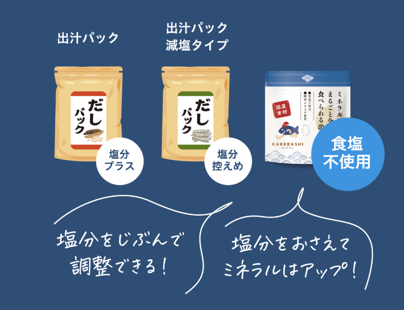 どんな料理も、うまみが深まる万能の出汁。それが『KAKEDASHI』です。 素材本来のカルシウム、マグネシウム、カリウム、鉄、亜鉛などのミネラルを毎日の食卓で補えます。たんぱく質もたっぷり。