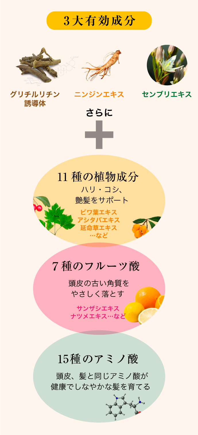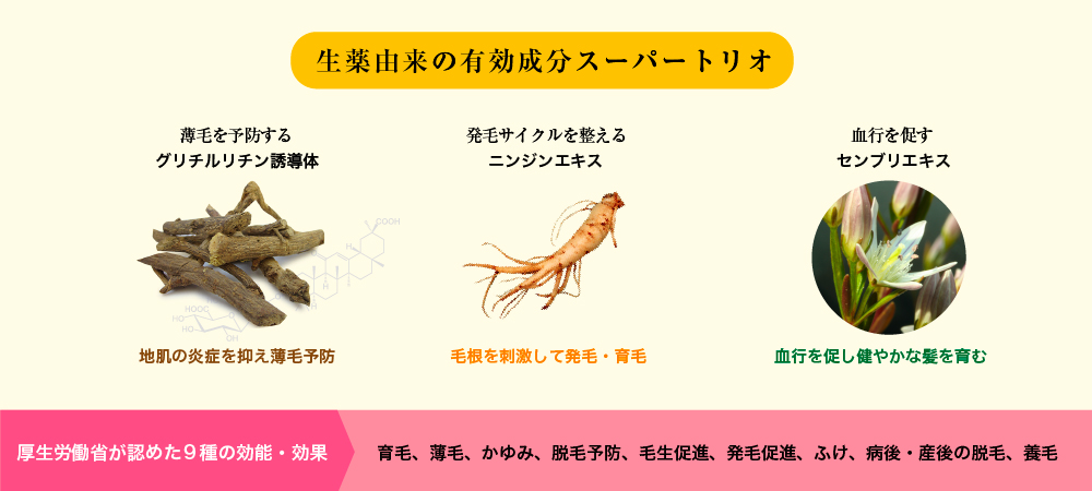 生薬由来の有効成分トリオ。 頭皮をすこやかに導くグリチルリチン誘導体。 サイクルを整えるニンジンエキス、血行を促すセンブリエキス。