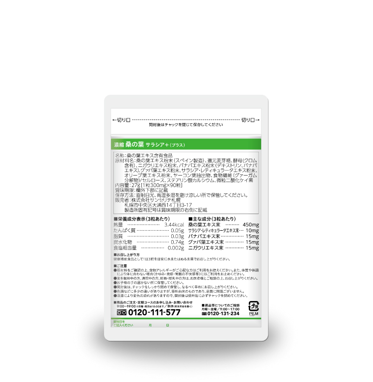 桑の葉エキス粉末(スペイン製造)、還元麦芽糖、酵母(クロム含有)、ニガウリエキス粉末、バナバエキス粉末(デキストリン、バナバエキス)、グァバ葉エキス粉末、サラシア・レティキュラータエキス粉末、オリーブ葉エキス粉末、ヤーコンエキス粉末/セルロース、ステアリン酸カルシウム、微粒二酸化ケイ素