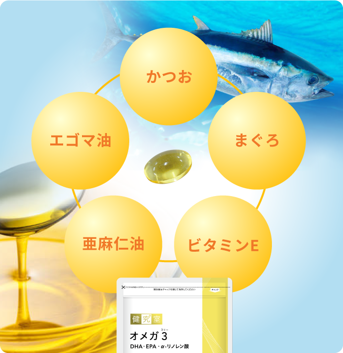 まぐろ、かつおの油のみを使用した純国産の原料を厳選した高品質のDHA・EPAと、亜麻仁油、エゴマ油のα-リノレン酸を配合。