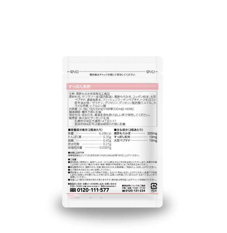 ■原材料 サフラワー油(国内製造)、黒酢もろみ末、スッポン粉末、大豆ペプチド、濃縮黒酢末、フィッシュコラーゲンペプチド、トウモロコシ胚芽抽出物、ゼラチン、グリセリン、グリセリン脂肪酸エステル、カラメル色素、ヒアルロン酸